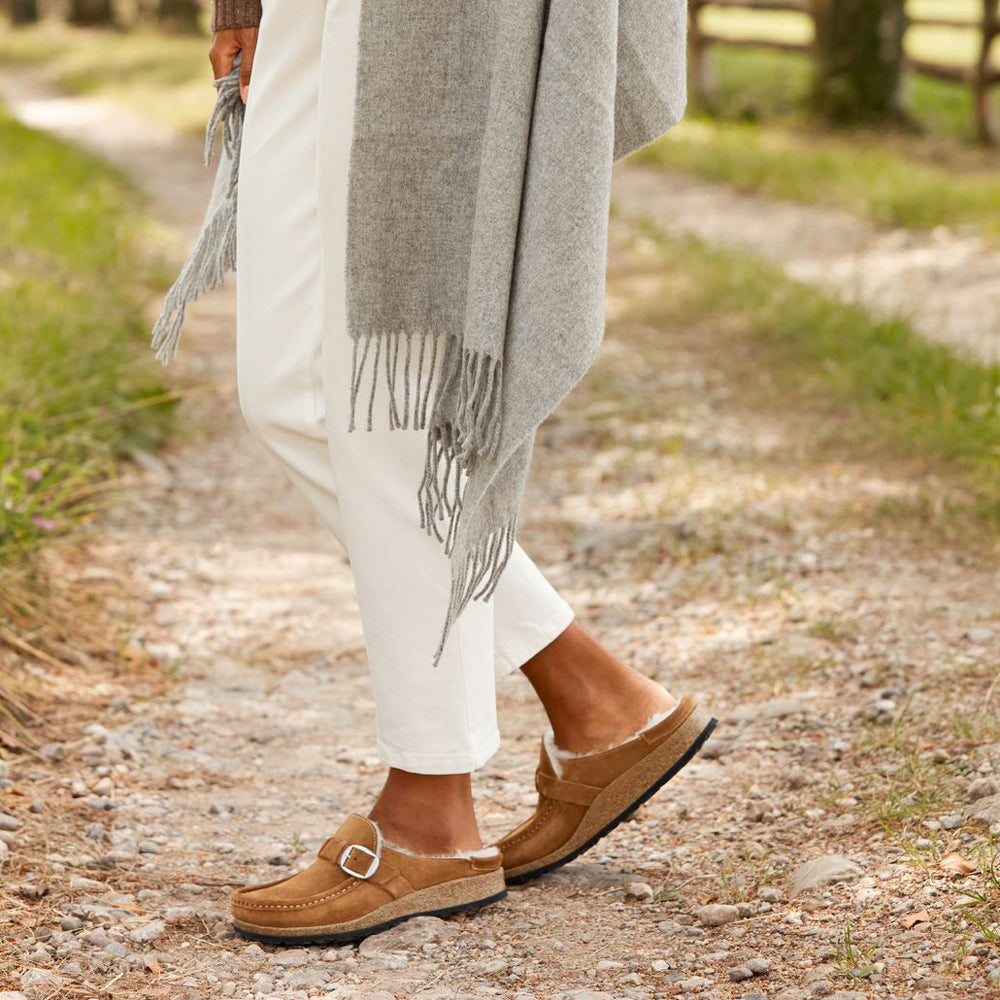 This moccasin-inspired style combines the traditional support of a Birkenstock with a playful upper design. Luxurious shearling lines the entire upper and footbed of this clog, offering a cozy feel.